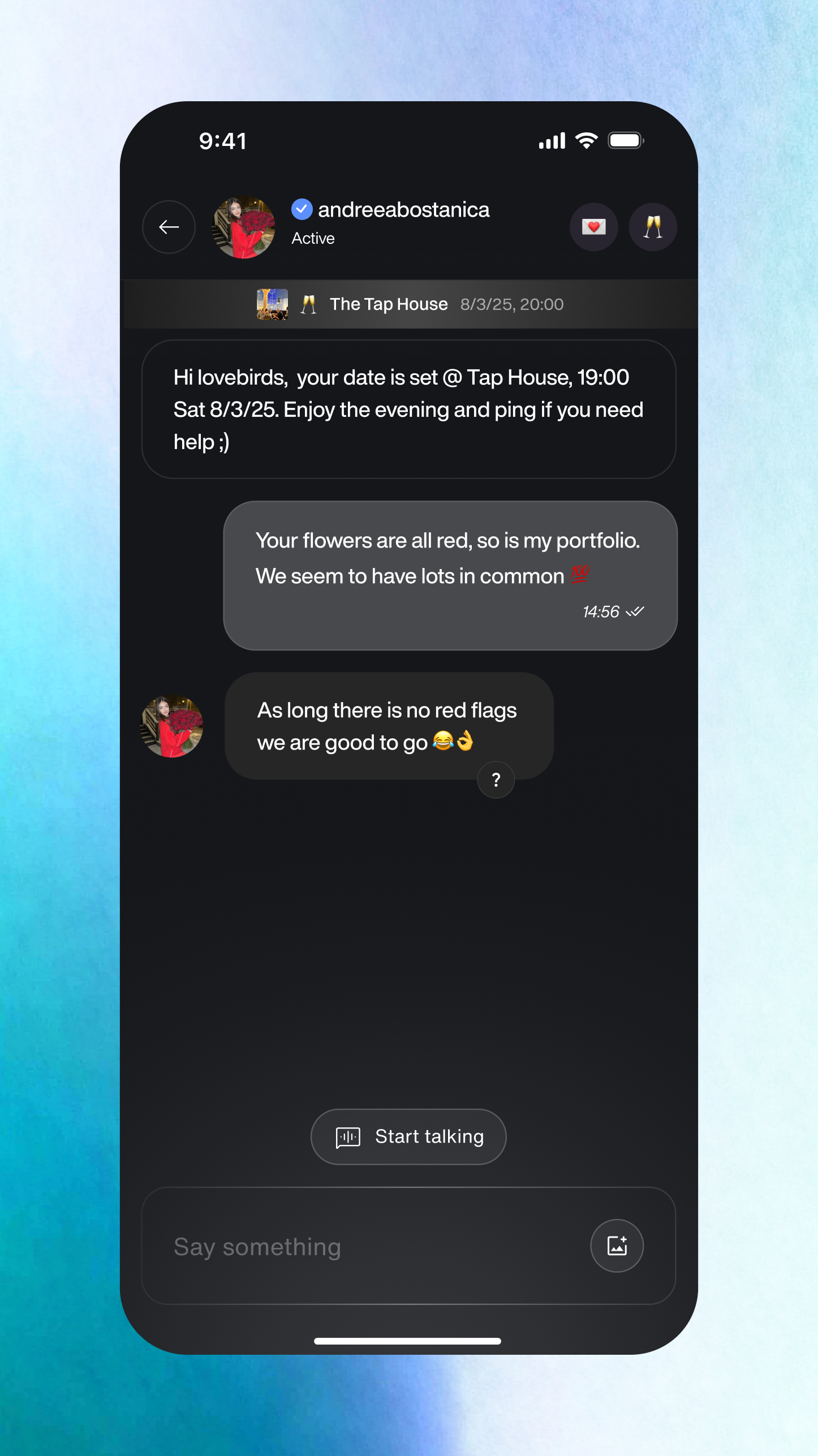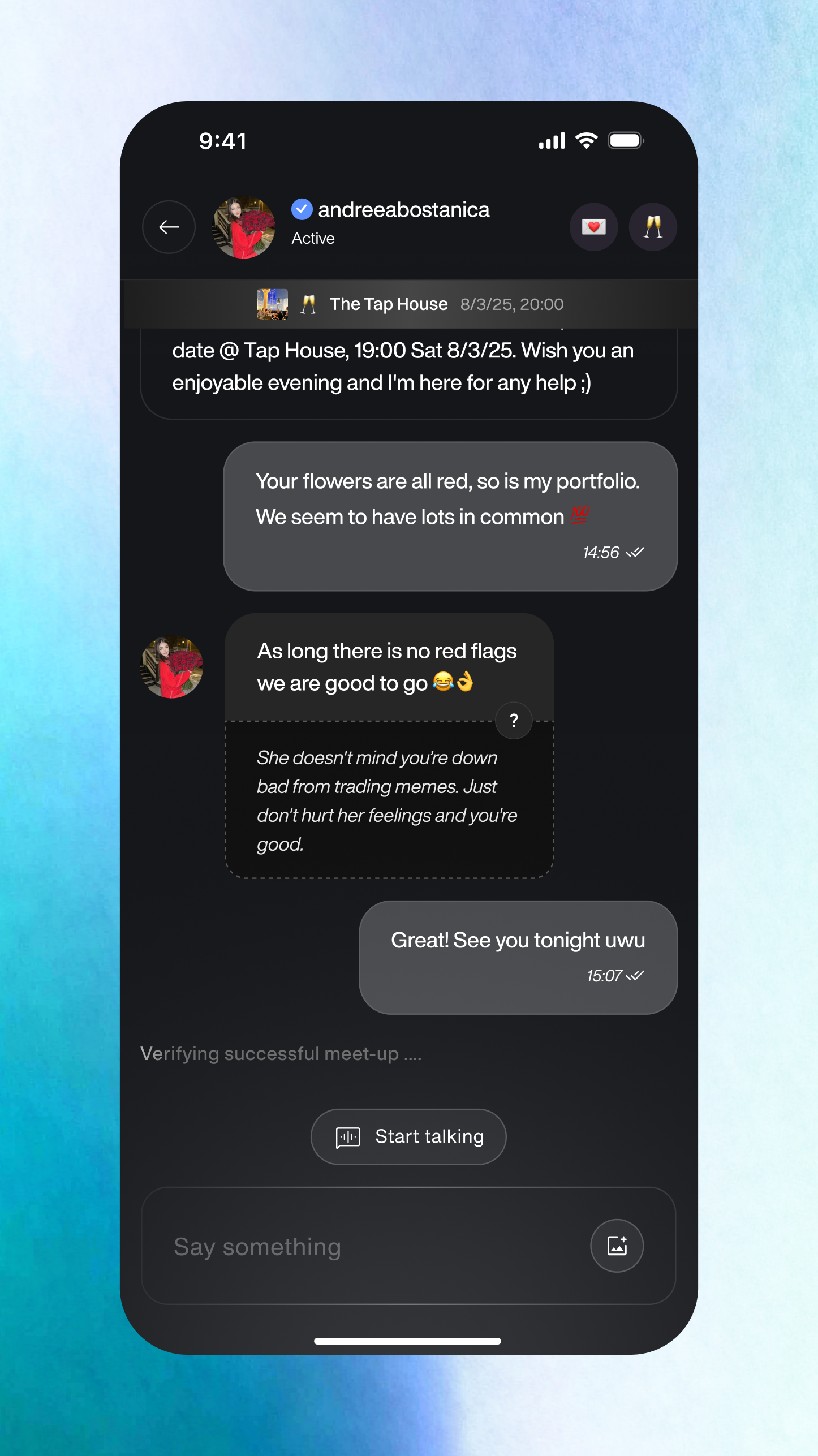 The concierge model solves the cold-start problem. Instead of two strangers trying to spark chemistry through text, the AI bridges the gap with context, shared interests, and suggested topics.