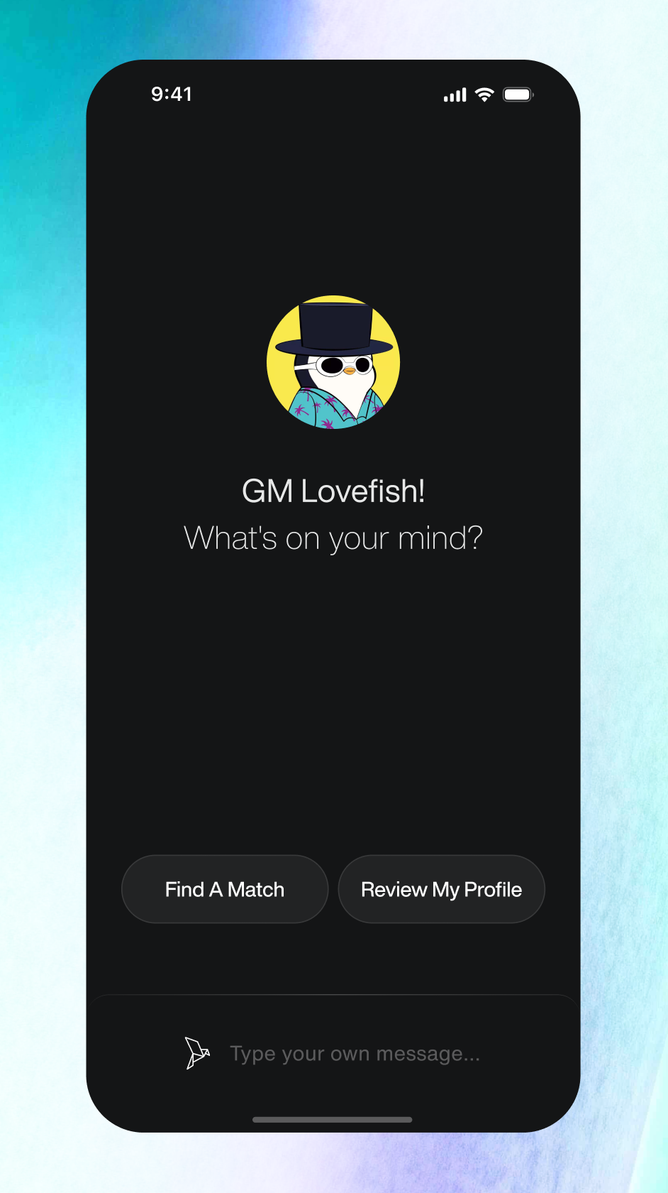 The AI agent — a bird character with personality and warmth — acts as a personal matchmaker. It greets users with "GM Lovefish!", scans the network for compatible matches, and presents each one with context and reasoning, not just photos.