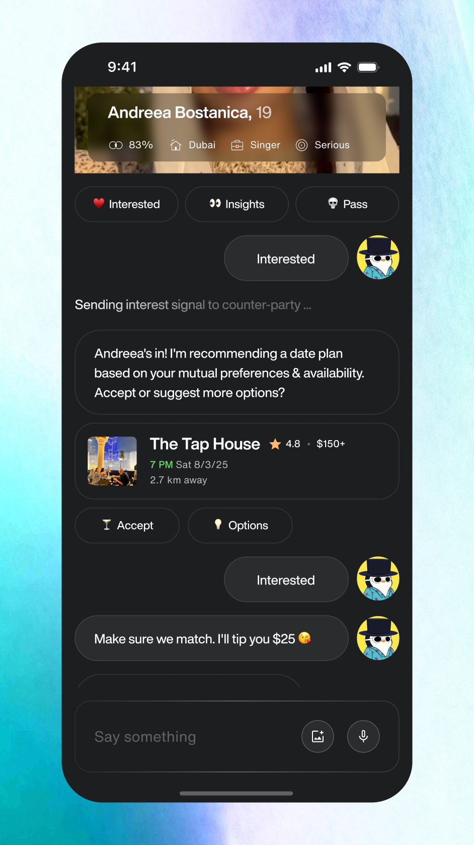 A chat-first interface where the AI is a proactive matchmaker, not a passive filter. It surfaces insights about potential matches, suggests conversation starters, and books the date once both parties agree.