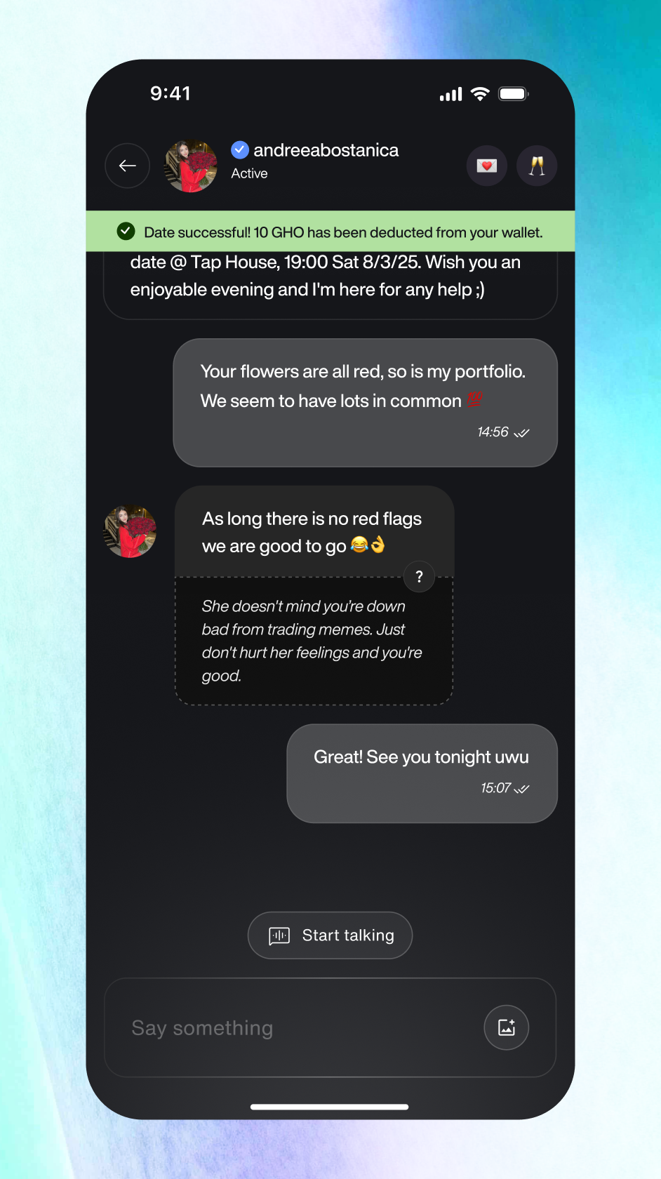 When two users start chatting, the AI shifts from matchmaker to context provider. It surfaces relevant insights as subtle tooltips. "She doesn't mind you're down bad from trading memes. Just don't hurt her feelings and you're good." Playful. Honest. Then it gets out of the way.