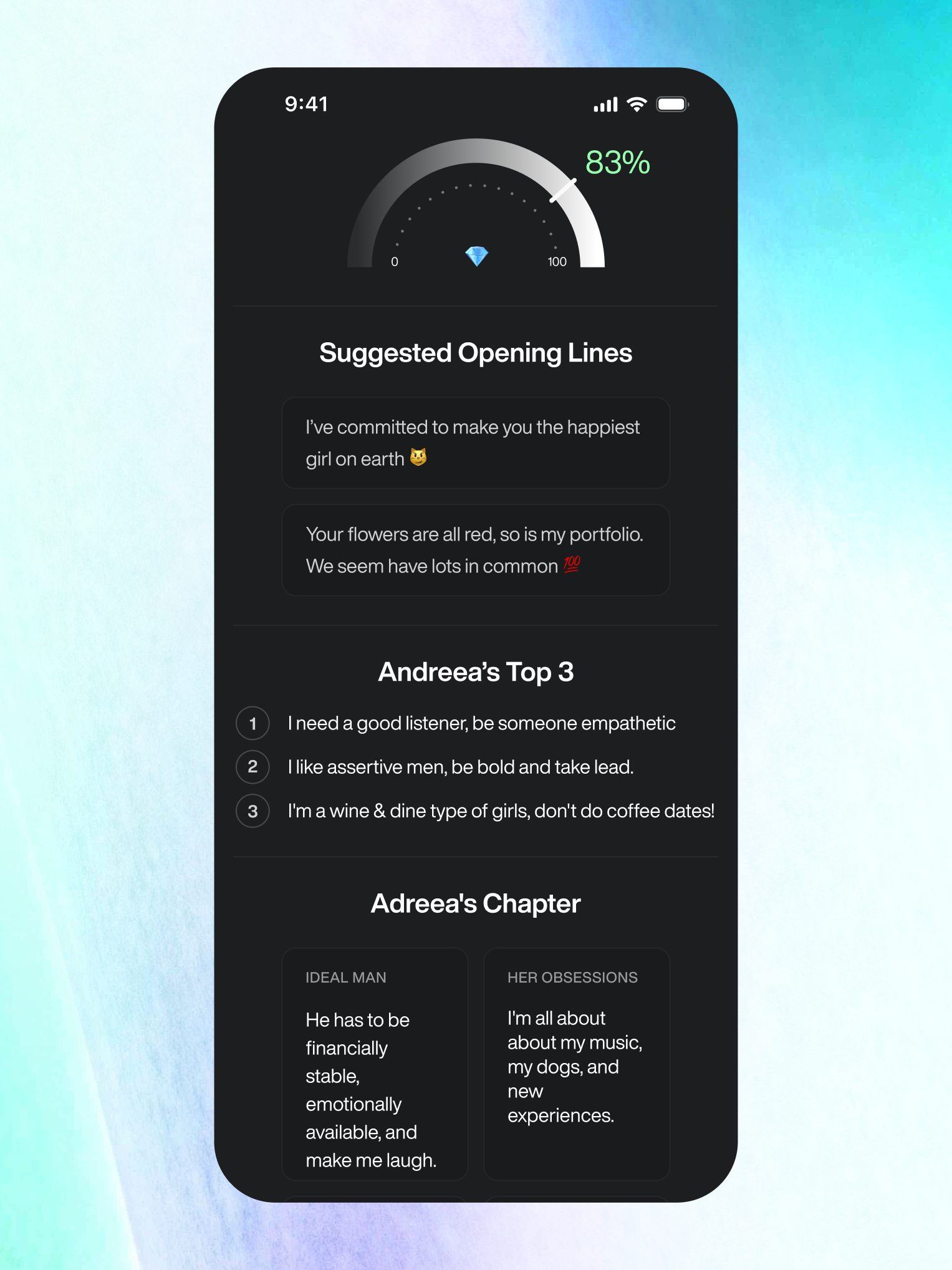 AI-generated personality profiles, opening line suggestions, top 3 values