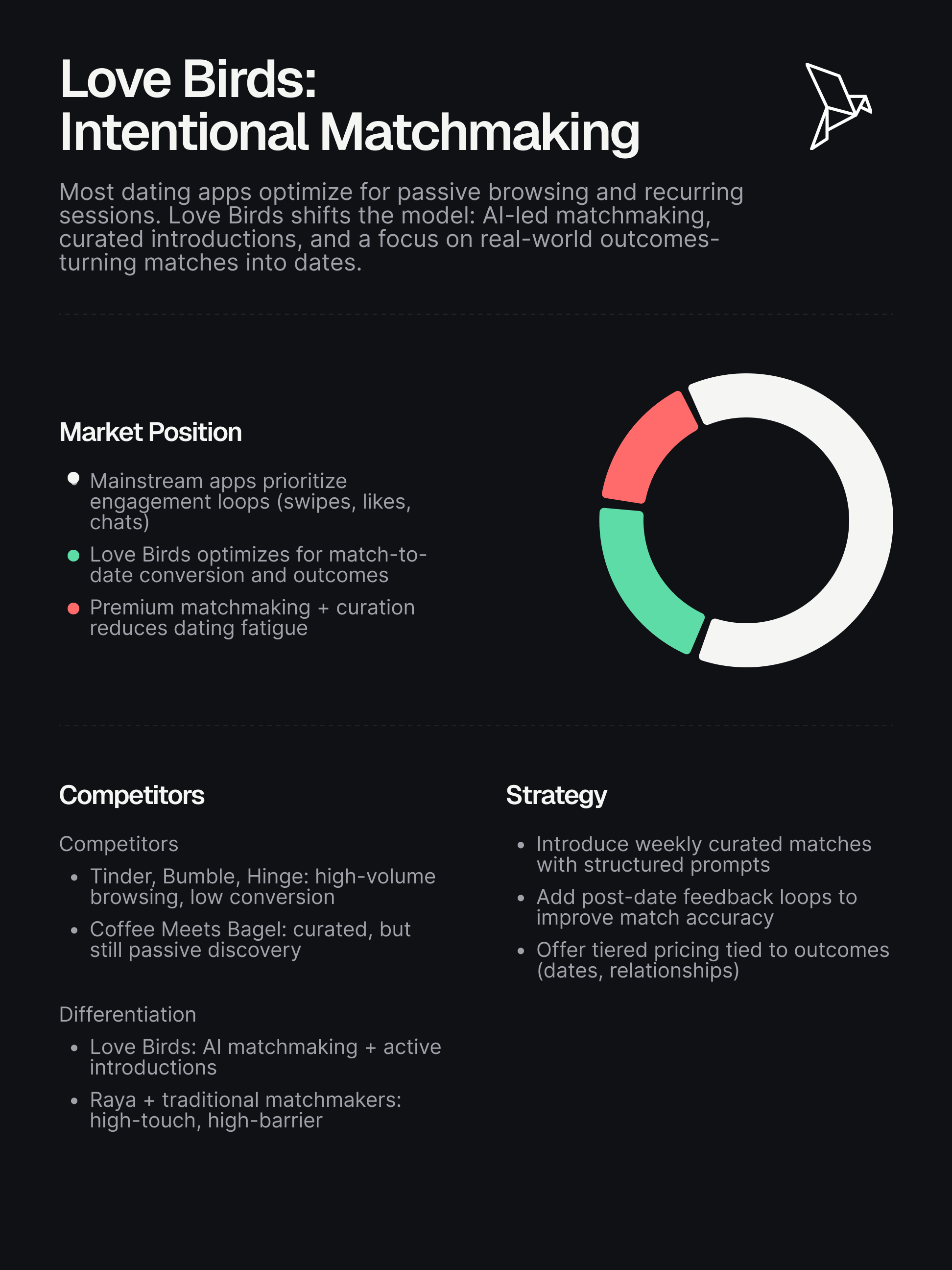 Love Birds started as an exploration of how AI could reshape a category everyone knows is broken. What surprised me most was how much the design problem was about emotional pacing, not technology.